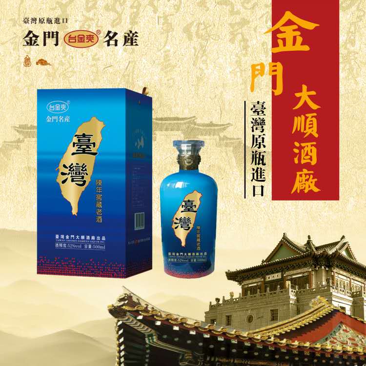 金門大順酒廠,座落于金門北緯24.5度,地處海隅,濱大陸,得天獨厚的地理,使它擁有絕佳的水質(zhì)、空氣、氣候及原料的四大天然釀酒條件。金門大順酒廠的高粱酒釀造是利用金門特產(chǎn)『旱地高粱』、引用當(dāng)?shù)厮|(zhì)甘甜的泉水、金門潔凈的空氣與氣候條件,并承襲傳統(tǒng)古法之釀酒技術(shù),加上獨家的釀酒專業(yè)技術(shù)經(jīng)驗【三離二鍋一翻】的發(fā)酵釀酒工藝,經(jīng)掐頭去尾后入庫,去蕪存菁。而造就出金門大順酒廠的高粱酒特色「清澈透明、質(zhì)地純凈、芳香濃郁」之一系列高粱酒。金門大順酒廠制酒承襲著金門得天獨厚的地理環(huán)境,加上三代流傳之古法醇釀技技術(shù),結(jié)合經(jīng)驗與現(xiàn)代化生產(chǎn),釀出風(fēng)味獨特,香、醇、甘、冽的【臺島】【臺金爽】【牛樟芝高粱酒】【龍騰鳳舞】【紅雙十】【陳高吶】【臺灣小酒】等多樣系列產(chǎn)品。真實原味、清香散發(fā),甘冽醇厚的絕佳風(fēng)味。